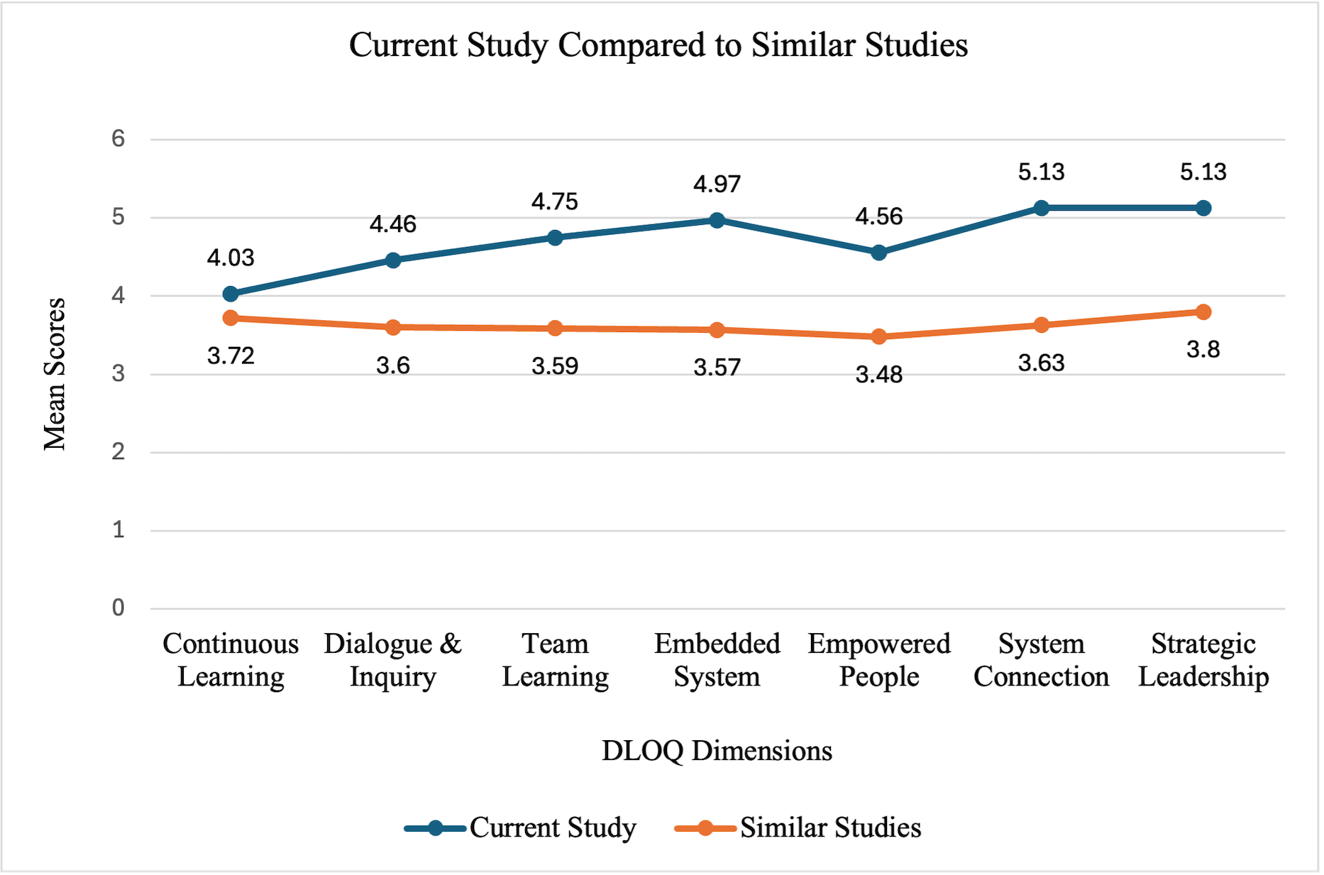 Note: The learning organization framework encompasses seven dimensions: creating continuous learning opportunities (CL), promoting inquiry and dialogue (DI), encouraging collaboration and team learning (TL), establishing systems to capture and share learning (ES), empowering people toward a collective vision (EP), connecting the organization to its environment (SC), and providing strategic leadership for learning (SL) (Watkins & Marsick, 1997).