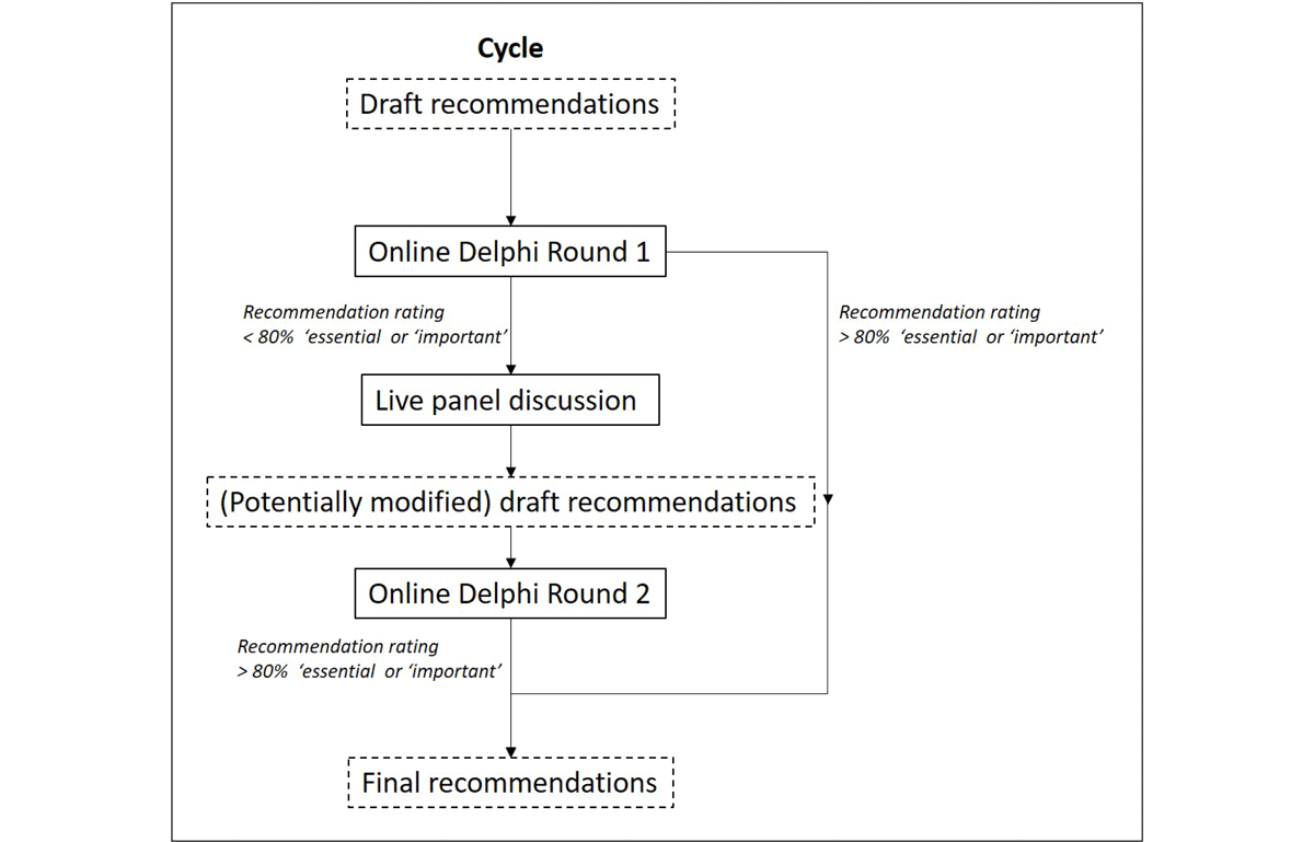 Next, we systematically collected expert input from a large stakeholder panel (partly overlapping with the initial group, see Defining research questions for systematic literature searches), including professionals, peer workers, and volunteers from academia, mental health care, prevention, youth work, and education (see Acknowledgements for a complete list). These stakeholders were selected based on their complementary forms of expertise: academic knowledge on child and adolescent development and mental health, practical experience from daily work with young people in clinical, educational, and community settings, and lived experience through peer workers who understand firsthand the challenges young people face. Together, this spectrum of expertise ensured that the guidance was developmentally appropriate, contextually grounded, and sensitive to real-world experience. We formalized this step using a modified Delphi consensus method (Fitch et al., 2001; Hasson et al., 2000; Murphy et al., 1998). Panel members received the preliminary guidelines and completed an online survey on the draft recommendations. The Delphi process consisted of two rounds with a live panel discussion in between. Recommendations were presented in two cycles (two-week interval) for practical reasons (see Figure 1). In the first round, panel members rated each recommendation on a 5-point scale (“essential”, “important”, “I don’t know/doubtful”, “not important”, or “do not retain”) and could justify their rating or suggest changes. They could also propose new recommendations if they identified gaps. Before the live discussion, members received anonymized feedback comparing their responses with panel-wide results. Consensus was defined as ≥80% rating a recommendation as “essential” or “important”.