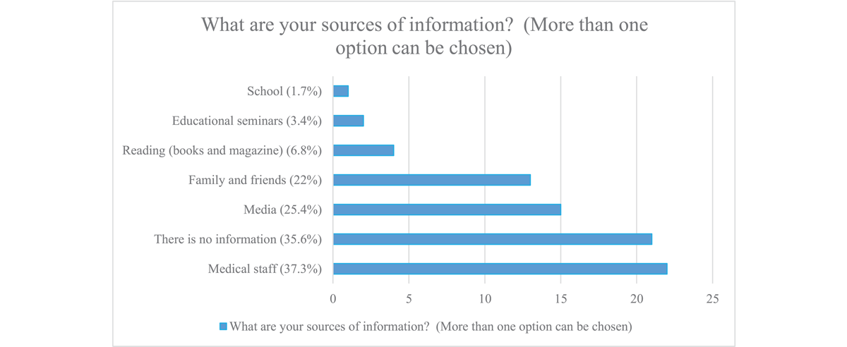 Results from questions where multiple-choice items, illustrated in the following graphs, were not incorporated into the scoring process. The data indicate that medical staff were the most frequently cited source of information, whereas schools were the least common source, as shown in Figure 1.