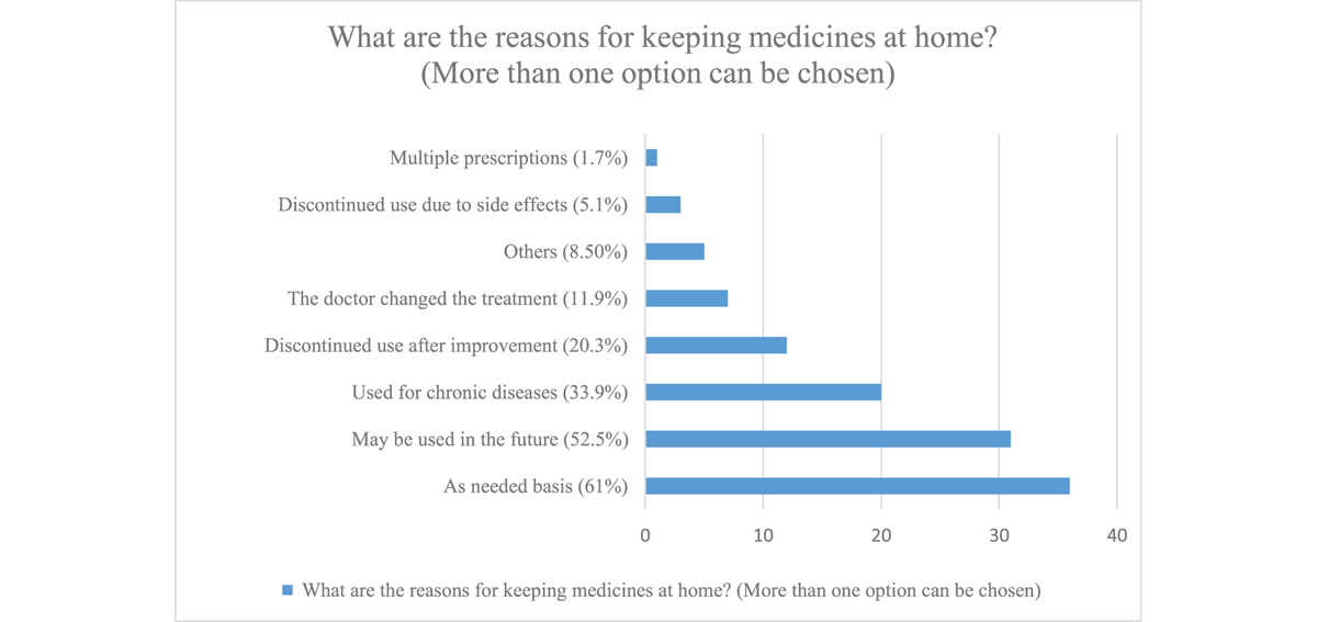 Regarding the reasons for storing medications at home, the most frequently selected response was “As needed basis”, as shown in Figure 2.
