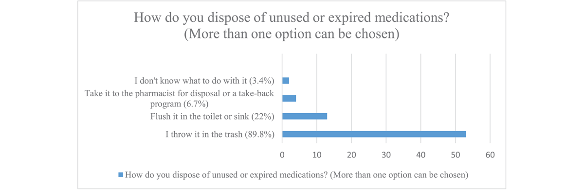 When asked about methods for disposing of unused or expired medications, the most commonly chosen answer was “I throw it in the trash”, as shown in Figure 4.