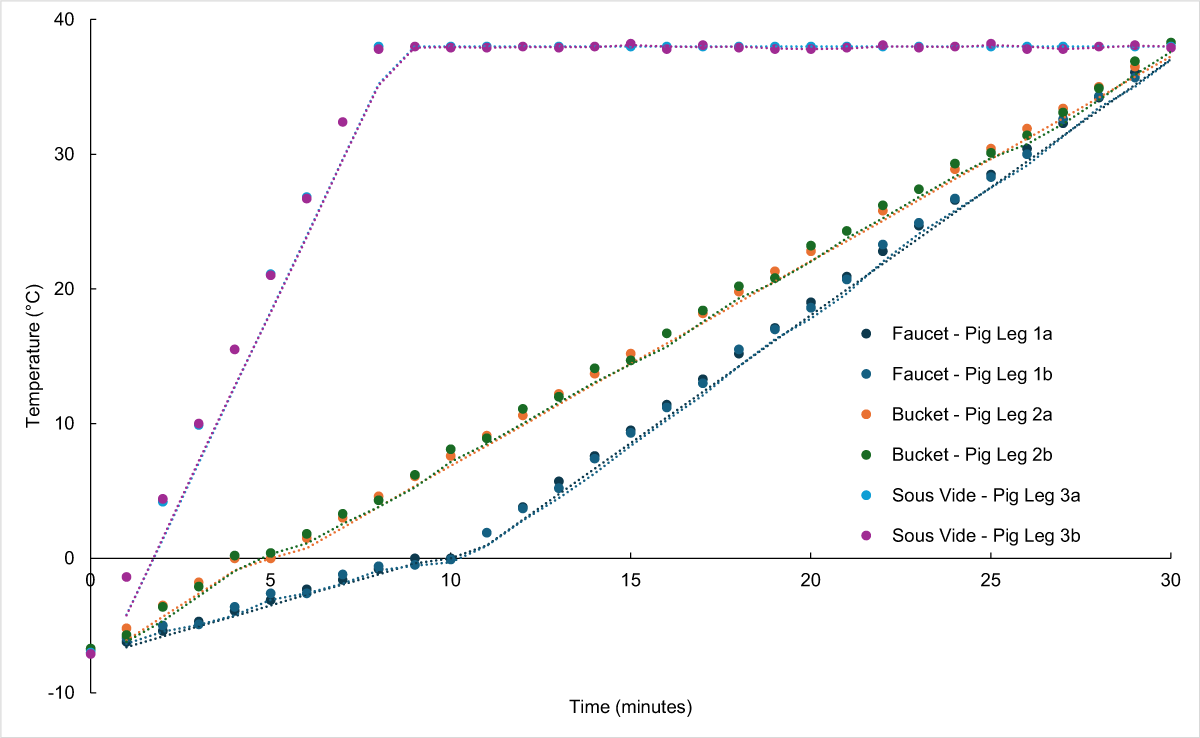 Prior to the start of each rewarming trial, the legs were removed from the freezer and placed in a 38°C rewarming environment. Each trial commenced immediately upon placing the frozen leg into the water, and temperature measurements were monitored continuously and recorded every minute throughout the rewarming process to monitor progress. Two sources of temperature data were collected during each trial: in-tissue temperatures and the temperatures of the rewarming water. The study protocol required that the rewarming water be maintained at 38°C. 2 trials were completed for each method (n = 2), using one porcine leg for each of the six trials (n = 6). No a priori sample size calculations were conducted, however, two trials were completed with each method to appraise internal validity, which required six porcine legs. No criteria were set when selecting specimens and no data was excluded from measurement or analysis. No randomisation or blinding methods were used when selecting experimental units or conducting trials. No control group was used because this study aims to compare variability in rewarming water temperature amongst the three methods.