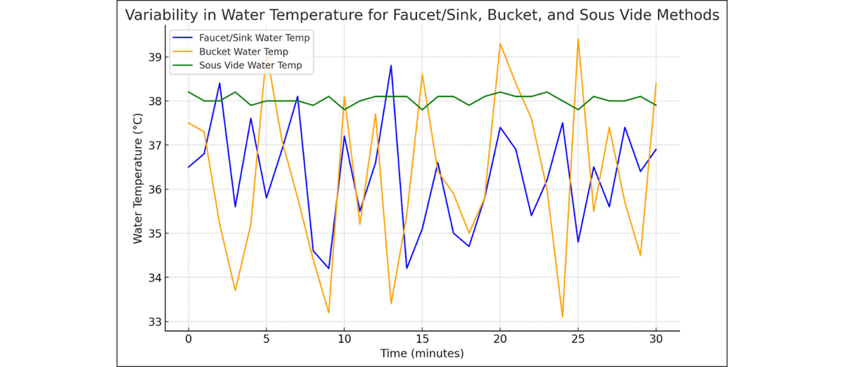The faucet/sink method demonstrated a mean water temperature of 36.30°C (SD = 1.22°C), with a wide range of temperatures fluctuating between 34.16°C and 38.84°C, indicating significant variability in temperature control. The bucket method showed even greater variability, with a mean water temperature of 36.31°C (SD = 1.84°C) and a temperature range of 33.12°C to 39.45°C. The need for frequent manual intervention to maintain the target temperature contributed to this high level of variability.